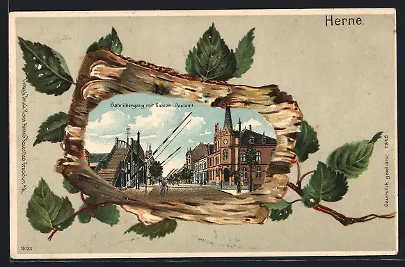 Passepartout-Lithographie Herne, Bahnübergang mit Kaiserl. Postamt im Birken-Passepartout