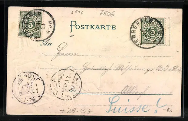 Personenbezogene Daten auf der Rückseite der Karte wurden durch blauen Textmarker unkenntlich gemacht. Die blauen Stellen sind auf die Vorderseite durchgeweicht und wirken sich negativ auf das Postkartenfoto aus