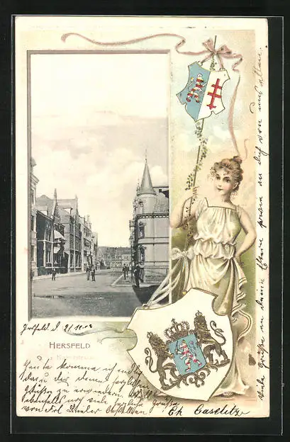Passepartout-Lithographie Hersfeld, Strassenpartie im Ort, Wappen