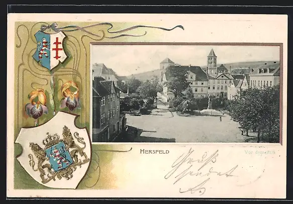 Passepartout-Lithographie Hersfeld, Strassenpartie mit Denkmal, Wappen