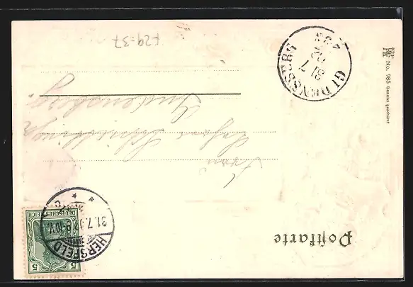 Personenbezogene Daten auf der Rückseite der Karte wurden durch blauen Textmarker unkenntlich gemacht. Die blauen Stellen sind auf die Vorderseite durchgeweicht und wirken sich negativ auf das Postkartenfoto aus