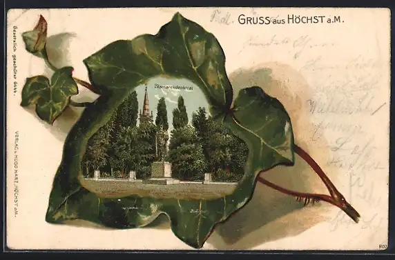 Passepartout-Lithographie Höchst a. M., Bismarckdenkmal in einem Efeublatt