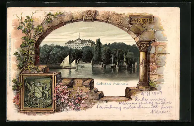 Passepartout-Lithographie Insel Mainau, Uferpartie mit Schloss, Wappen