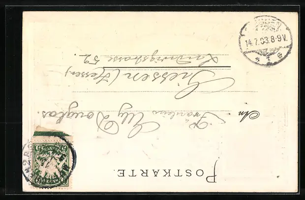 Personenbezogene Daten auf der Rückseite der Karte wurden durch blauen Textmarker unkenntlich gemacht. Die blauen Stellen sind auf die Vorderseite durchgeweicht und wirken sich negativ auf das Postkartenfoto aus