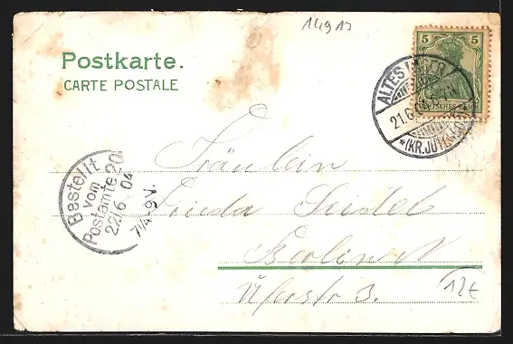 gelaufen 1904, Eckknicke oben u. re., Einrisse oben Mitte u. re., Stempelspur, guter Zustand