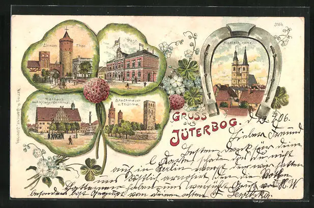 Passepartout-Lithographie Jüterbog, Zinnaer Thor, Post, Nicolaikirche, Kleeblatt