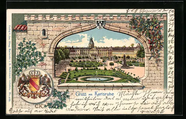 Passepartout-Lithographie Karlsruhe, Ansicht vom Schlossgarten, Wappen
