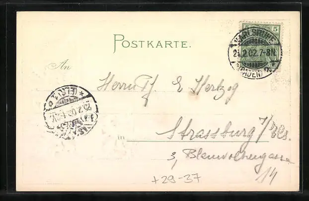 Personenbezogene Daten auf der Rückseite der Karte wurden durch blauen Textmarker unkenntlich gemacht. Die blauen Stellen sind auf die Vorderseite durchgeweicht und wirken sich negativ auf das Postkartenfoto aus