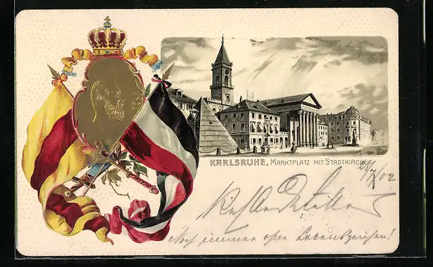 Passepartout-Lithographie Karlsruhe, Marktplatz mit Stadtkirche, Portrait des Königs