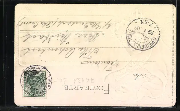 Personenbezogene Daten auf der Rückseite der Karte wurden durch blauen Textmarker unkenntlich gemacht. Die blauen Stellen sind auf die Vorderseite durchgeweicht und wirken sich negativ auf das Postkartenfoto aus
