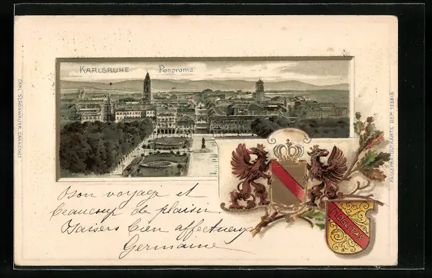 Passepartout-Lithographie Karlsruhe, Panorama, Wappen