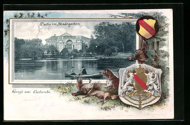 Passepartout-Lithographie Karlsruhe, Partie im Stadtgarten, Wappen