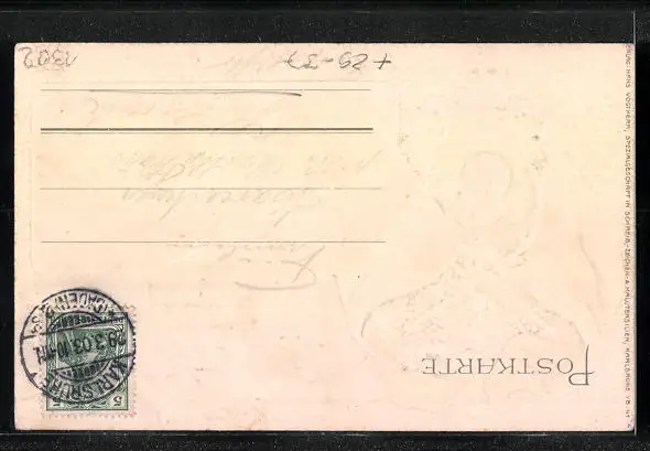 Personenbezogene Daten auf der Rückseite der Karte wurden durch blauen Textmarker unkenntlich gemacht. Die blauen Stellen sind auf die Vorderseite durchgeweicht und wirken sich negativ auf das Postkartenfoto aus