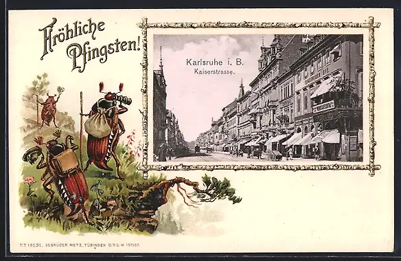 Passepartout-Lithographie Karlsruhe i. B., Kaiserstrasse, Maikäfer auf Wanderschaft