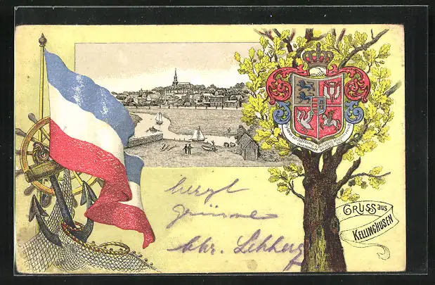 Passepartout-Lithographie Kellinghusen, Totalansicht, Stadtwappen