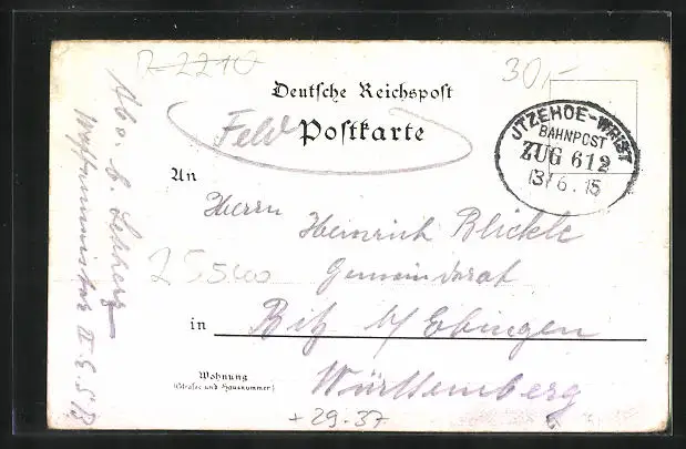 Personenbezogene Daten auf der Rückseite der Karte wurden durch blauen Textmarker unkenntlich gemacht. Die blauen Stellen sind auf die Vorderseite durchgeweicht und wirken sich negativ auf das Postkartenfoto aus