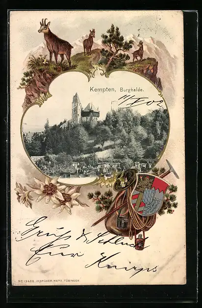 Passepartout-Lithographie Kempten / Allgäu, An der Burghalde, Bergsteigerausrüstung