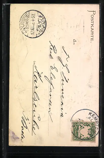Personenbezogene Daten auf der Rückseite der Karte wurden durch blauen Textmarker unkenntlich gemacht. Die blauen Stellen sind auf die Vorderseite durchgeweicht und wirken sich negativ auf das Postkartenfoto aus