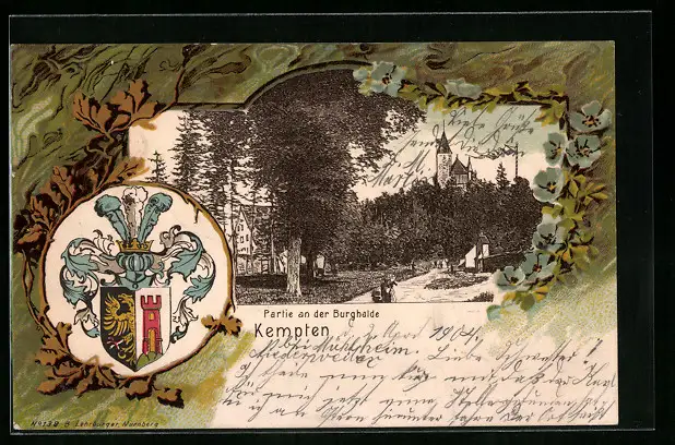 Passepartout-Lithographie Kempten, Partie an der Bergbahn, Wappen