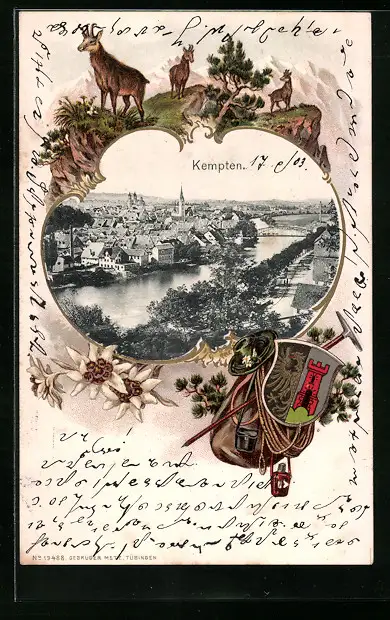Passepartout-Lithographie Kempten, Teilansicht mit Brücke, Gämse auf einem Berg, Wappen