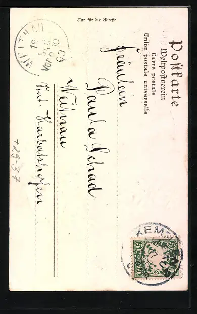 Personenbezogene Daten auf der Rückseite der Karte wurden durch blauen Textmarker unkenntlich gemacht. Die blauen Stellen sind auf die Vorderseite durchgeweicht und wirken sich negativ auf das Postkartenfoto aus