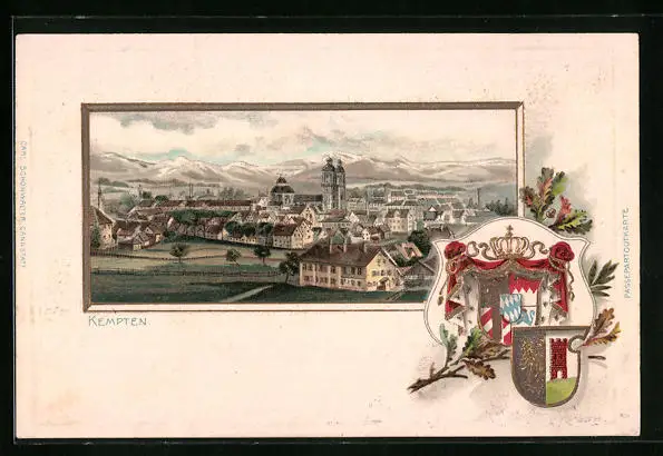 Passepartout-Lithographie Kempten, Totalansicht, Wappen, Eichenlaub