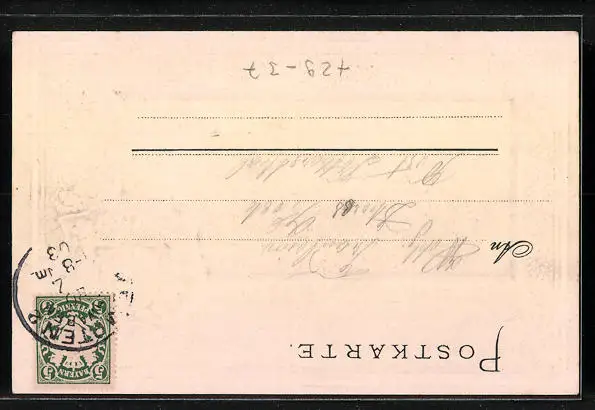 Personenbezogene Daten auf der Rückseite der Karte wurden durch blauen Textmarker unkenntlich gemacht. Die blauen Stellen sind auf die Vorderseite durchgeweicht und wirken sich negativ auf das Postkartenfoto aus
