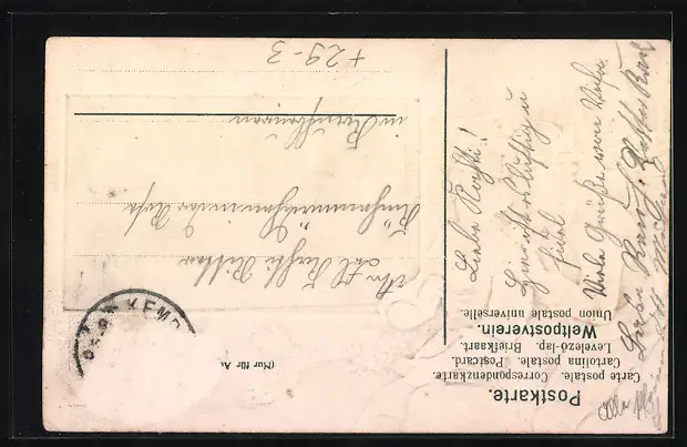 Personenbezogene Daten auf der Rückseite der Karte wurden durch blauen Textmarker unkenntlich gemacht. Die blauen Stellen sind auf die Vorderseite durchgeweicht und wirken sich negativ auf das Postkartenfoto aus