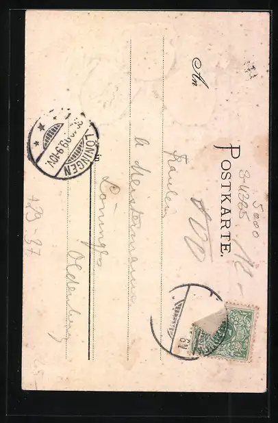 Personenbezogene Daten auf der Rückseite der Karte wurden durch blauen Textmarker unkenntlich gemacht. Die blauen Stellen sind auf die Vorderseite durchgeweicht und wirken sich negativ auf das Postkartenfoto aus