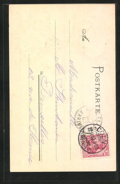 Personenbezogene Daten auf der Rückseite der Karte wurden durch blauen Textmarker unkenntlich gemacht. Die blauen Stellen sind auf die Vorderseite durchgeweicht und wirken sich negativ auf das Postkartenfoto aus