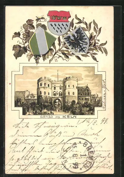 Passepartout-Lithographie Köln, Gesamtansicht vom Stadttor, Wappen