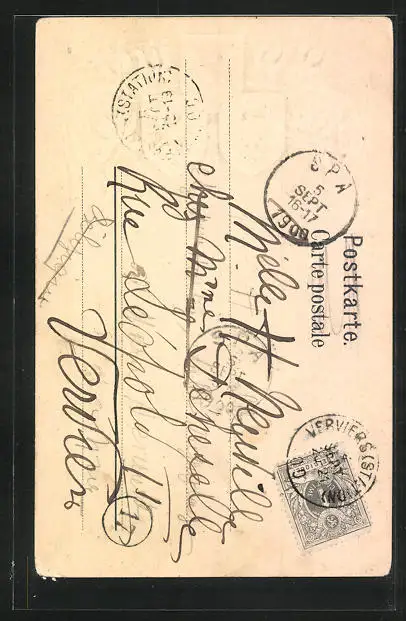 Personenbezogene Daten auf der Rückseite der Karte wurden durch blauen Textmarker unkenntlich gemacht. Die blauen Stellen sind auf die Vorderseite durchgeweicht und wirken sich negativ auf das Postkartenfoto aus
