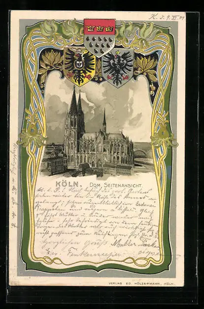 Passepartout-Lithographie Köln, Seitenansicht des Doms mit Wappen