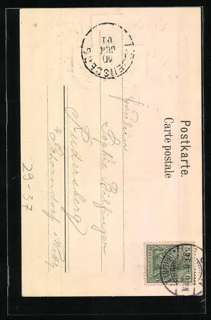 Personenbezogene Daten auf der Rückseite der Karte wurden durch blauen Textmarker unkenntlich gemacht. Die blauen Stellen sind auf die Vorderseite durchgeweicht und wirken sich negativ auf das Postkartenfoto aus
