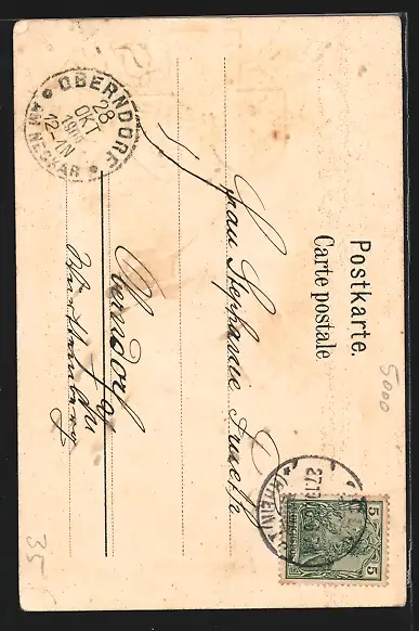 Personenbezogene Daten auf der Rückseite der Karte wurden durch blauen Textmarker unkenntlich gemacht. Die blauen Stellen sind auf die Vorderseite durchgeweicht und wirken sich negativ auf das Postkartenfoto aus