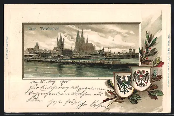 Passepartout-Lithographie Köln, Totalansicht des Ortes, Wappen, Adler