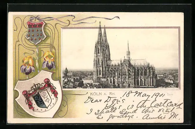Passepartout-Lithographie Köln a. Rh., Blick zum Dom, Wappen