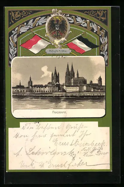 Passepartout-Lithographie Köln a. Rh., Panorama, Wappen