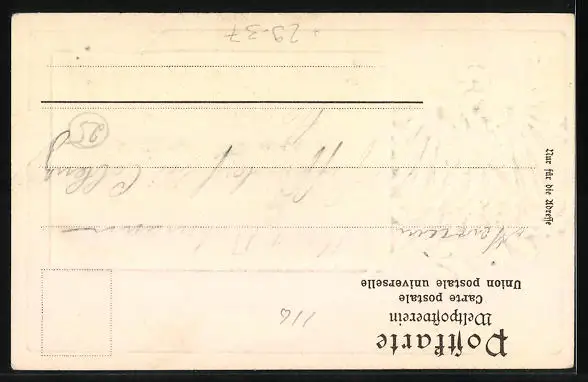 Personenbezogene Daten auf der Rückseite der Karte wurden durch blauen Textmarker unkenntlich gemacht. Die blauen Stellen sind auf die Vorderseite durchgeweicht und wirken sich negativ auf das Postkartenfoto aus