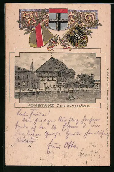 Passepartout-Lithographie Konstanz, Conciliumgebäude mit Wappen