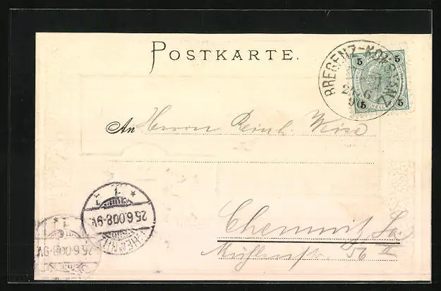 Personenbezogene Daten auf der Rückseite der Karte wurden durch blauen Textmarker unkenntlich gemacht. Die blauen Stellen sind auf die Vorderseite durchgeweicht und wirken sich negativ auf das Postkartenfoto aus