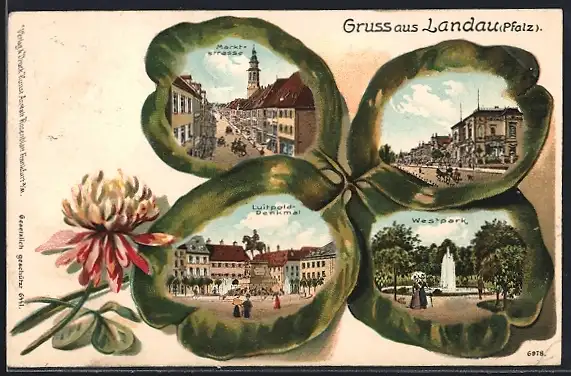 Passepartout-Lithographie Landau / Pfalz, Markt & Strasse, Westpark im Kleeblatt