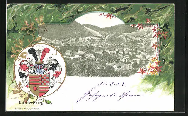 Passepartout-Lithographie Lauterberg, Ortsansicht aus der Vogelschau, Wappen