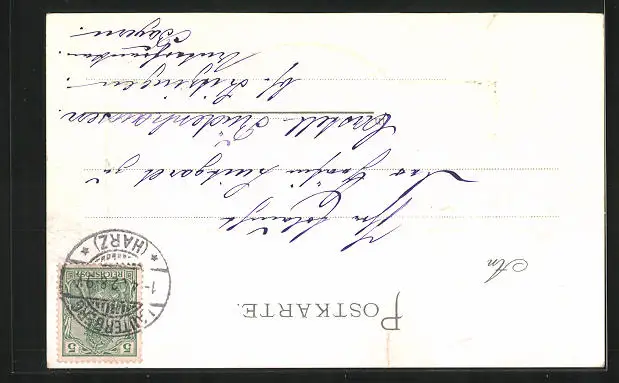 Personenbezogene Daten auf der Rückseite der Karte wurden durch blauen Textmarker unkenntlich gemacht. Die blauen Stellen sind auf die Vorderseite durchgeweicht und wirken sich negativ auf das Postkartenfoto aus