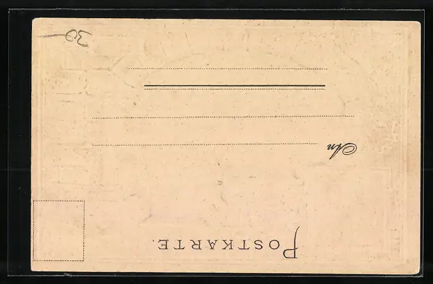 Personenbezogene Daten auf der Rückseite der Karte wurden durch blauen Textmarker unkenntlich gemacht. Die blauen Stellen sind auf die Vorderseite durchgeweicht und wirken sich negativ auf das Postkartenfoto aus