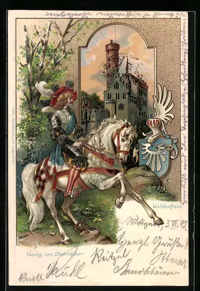 Passepartout-Lithographie Lichtenstein, Georg Sturmfeder vor dem Schloss, Wappen