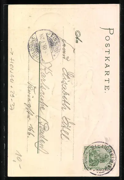 Personenbezogene Daten auf der Rückseite der Karte wurden durch blauen Textmarker unkenntlich gemacht. Die blauen Stellen sind auf die Vorderseite durchgeweicht und wirken sich negativ auf das Postkartenfoto aus
