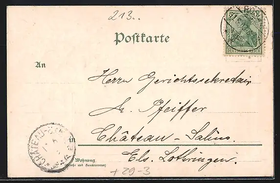 Personenbezogene Daten auf der Rückseite der Karte wurden durch blauen Textmarker unkenntlich gemacht. Die blauen Stellen sind auf die Vorderseite durchgeweicht und wirken sich negativ auf das Postkartenfoto aus