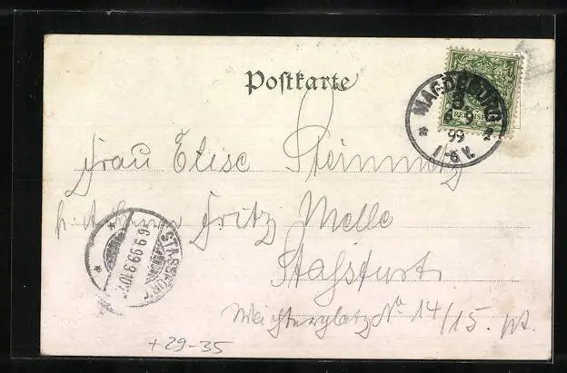 Personenbezogene Daten auf der Rückseite der Karte wurden durch blauen Textmarker unkenntlich gemacht. Die blauen Stellen sind auf die Vorderseite durchgeweicht und wirken sich negativ auf das Postkartenfoto aus
