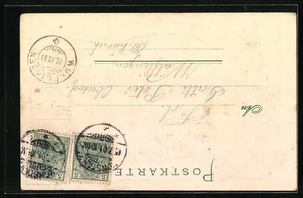 Personenbezogene Daten auf der Rückseite der Karte wurden durch blauen Textmarker unkenntlich gemacht. Die blauen Stellen sind auf die Vorderseite durchgeweicht und wirken sich negativ auf das Postkartenfoto aus